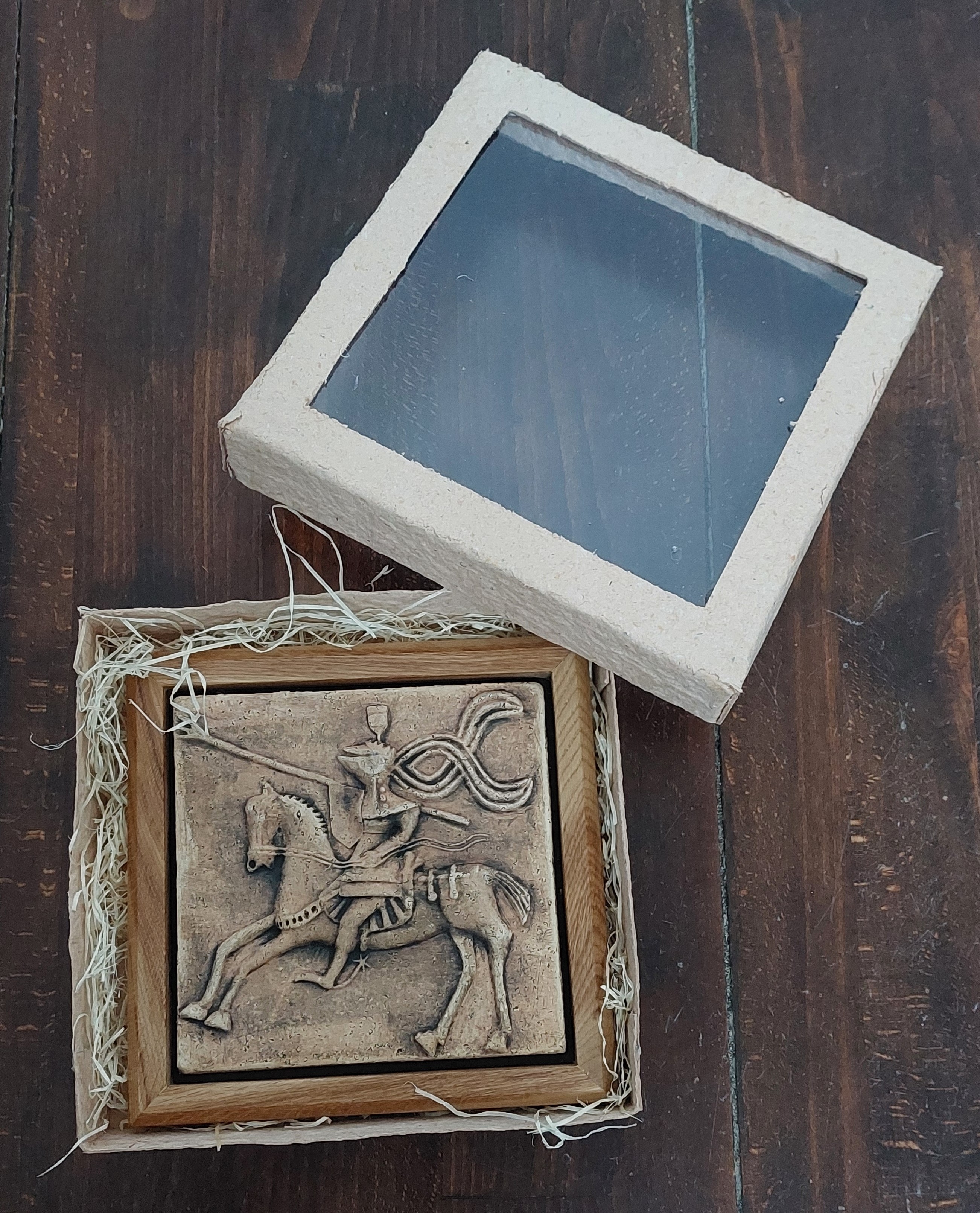 Keramická kachle na dřevě v krabičce z ručního papíru.